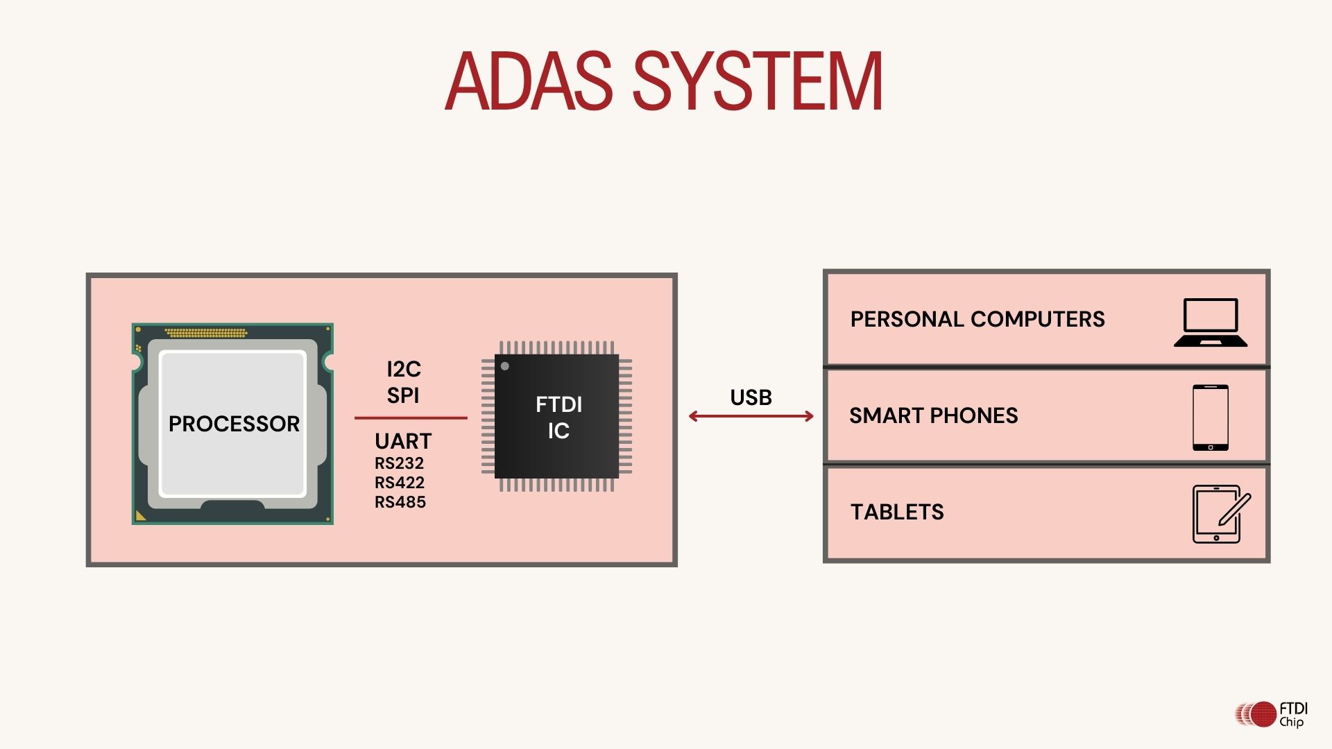 USB (Universal Serial Bus) with ADAS is possible with FTDI products to connect to a vehicle’s onboard computer or infotainment system via a USB port. Here are some usage scenarios: