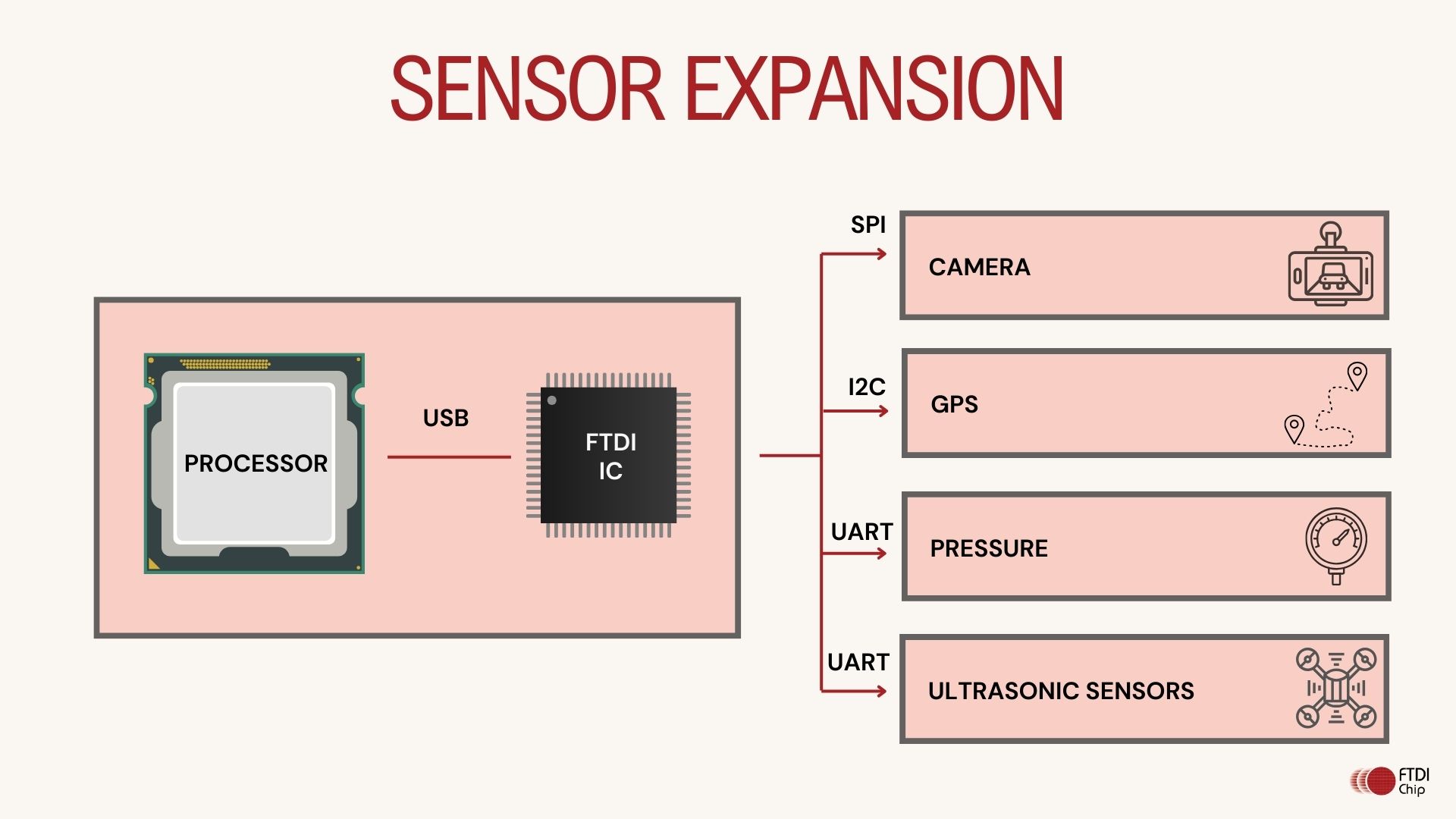 FTDI ICs are able to connect to the USB Host on embedded processors allowing for increased number of interfaces which can then connect to various sensors within the car, i.e. cameras, ultrasonic sensors, GPS, fatigue detection and more!