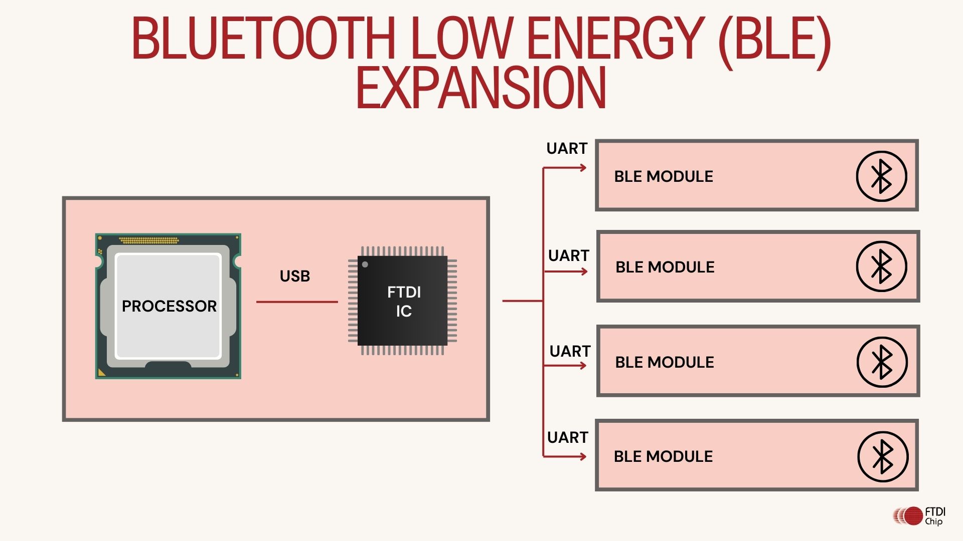 FTDI ICs are capable to connect to the USB Host on embedded processors allowing for expanding the number of BLE modules.