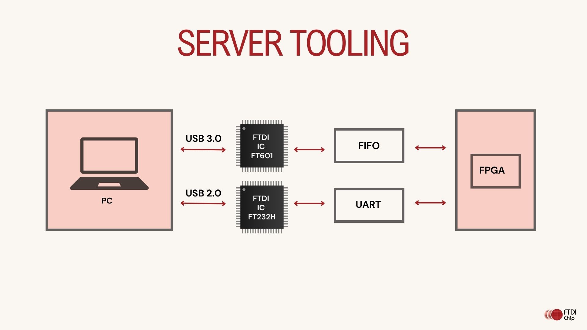 FTDI ICs can be leveraged in various ways for server tooling, particularly in scenarios requiring high-speed data processing, hardware acceleration and custom interface development. The two ICs discussed in this article are FT601 and FT232H.