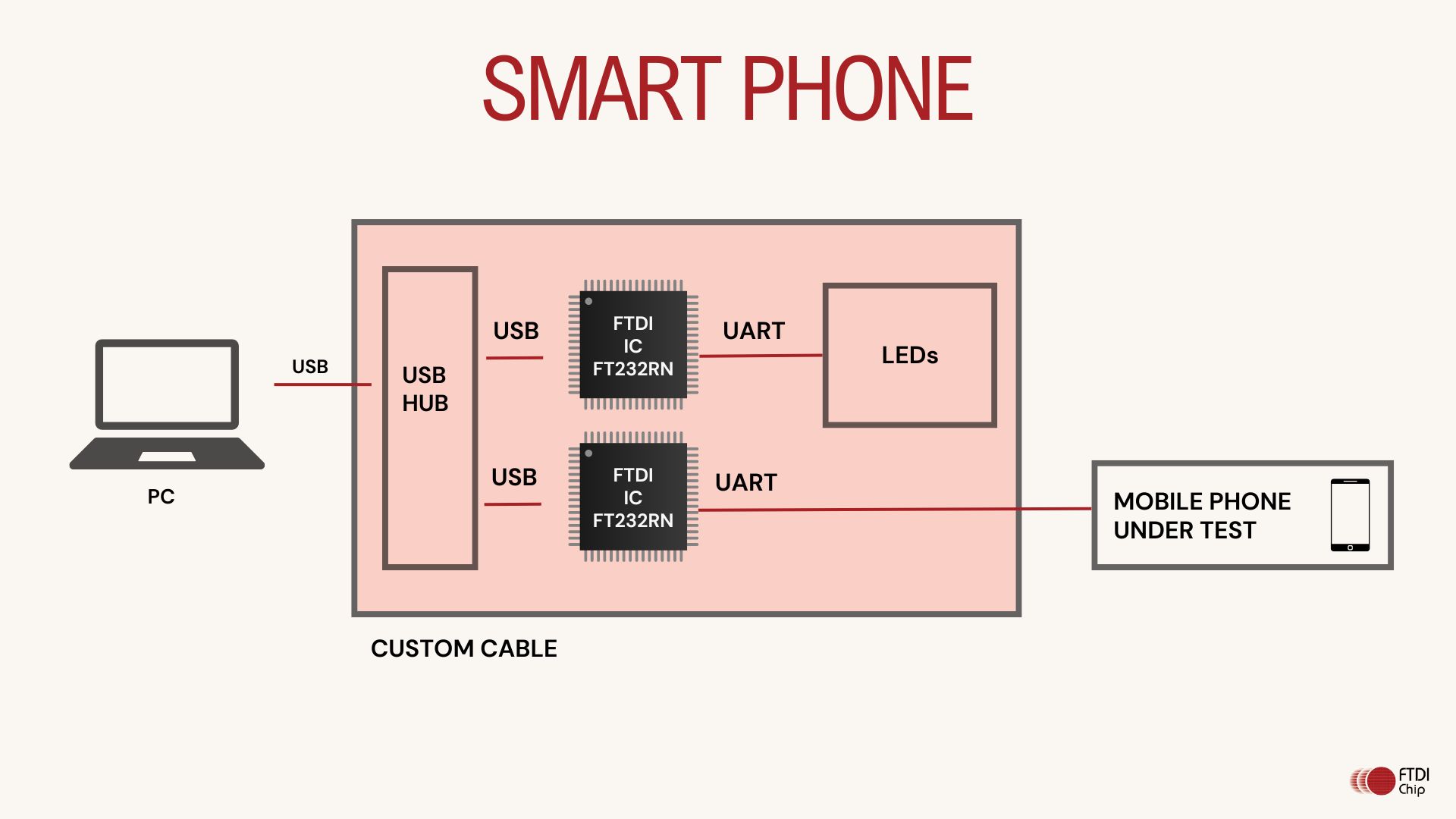 The FTDI IC can handle the serial mux interface from the mobile phone under test and control LEDs to show test status. FTDI can easily provide a USB interface to the test PC with our USB to UART based products.