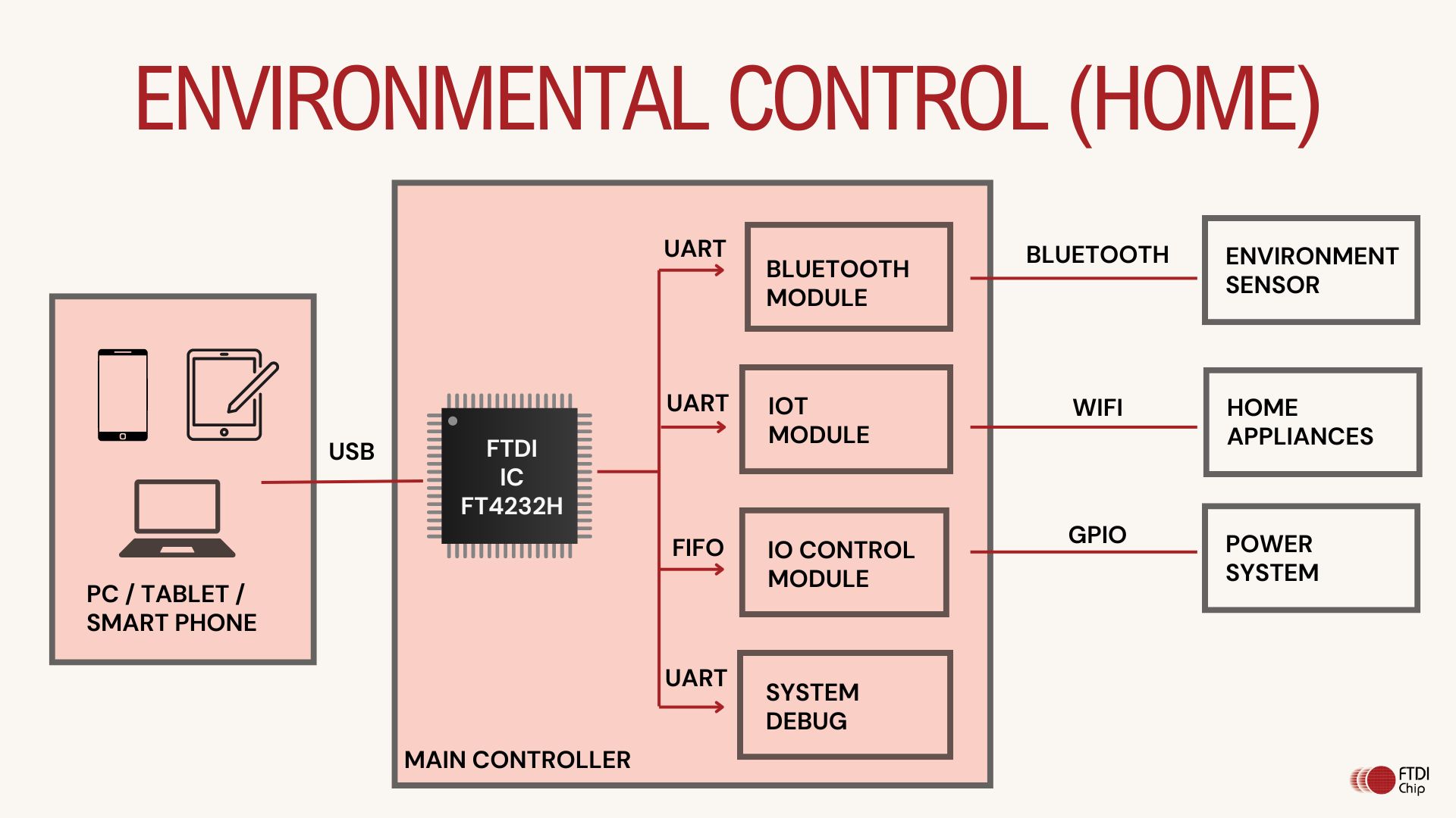 Environment control system can monitor indoor air quality parameters like pollutants (e.g., VOCs, CO2, particulate matter) through one channel of FT4232H device and trigger action like turning on and off air purifiers through another channel of FT4232H device.
