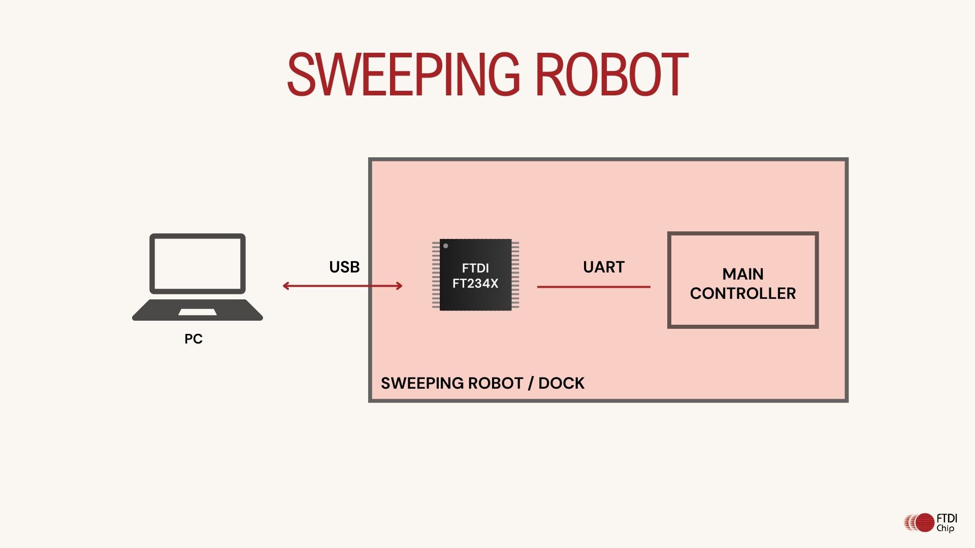 The block diagram below shows at a high level how FTDI’s FT234XD can be integrated into the sweeping robot. This USB to UART IC can be used for firmware updates, configuration and debug.