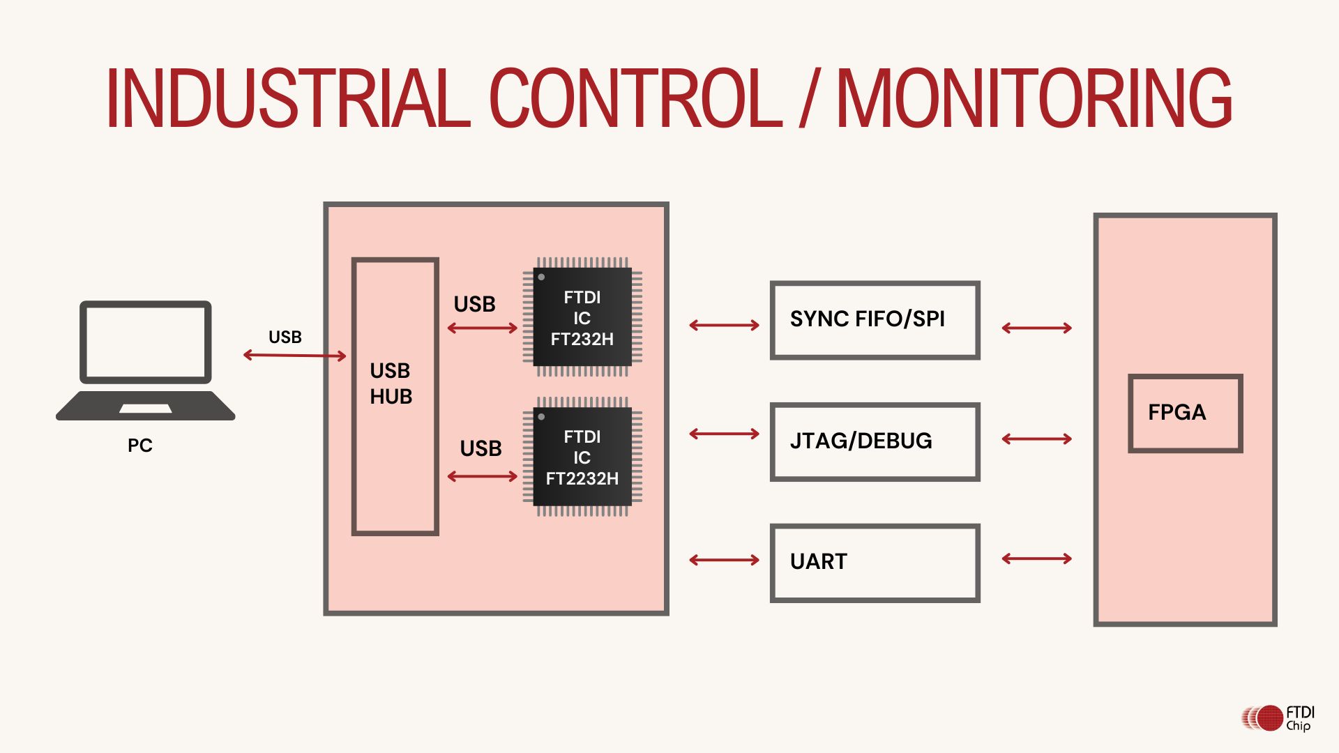 An application example of using FTDI devices for industrial control and monitoring can be seen with their integration with FPGAs.